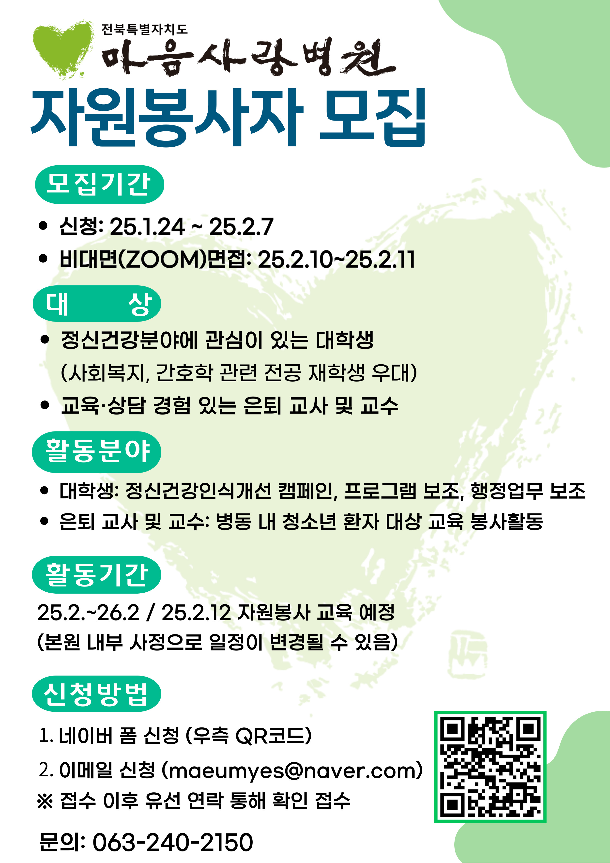 사랑합니다 전북특별자치도 마음사랑병원에서는 정신건강전문봉사단을 모집하고 있습니다!